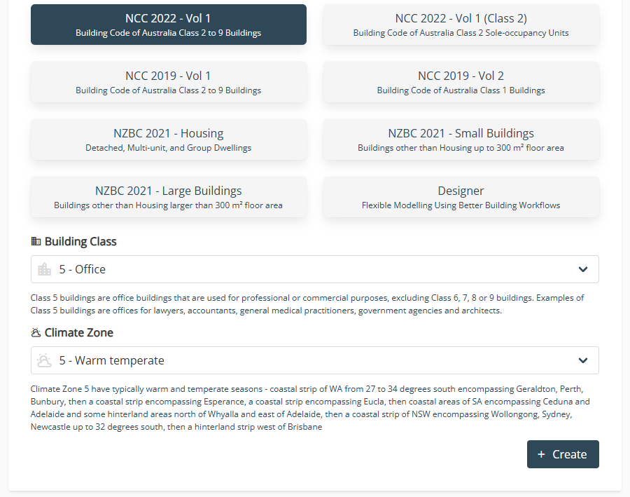 Finally, set up a Workflow by choosing either a local building code or designer mode. If using a building code, you’ll need to specify the 'Building Class' and the 'Climate Zone'. Once these details are in place, hit '+Create' and you're ready to begin your first design.
