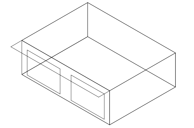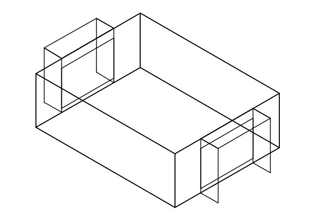Case 630 is identical to Case 620 except for the addition of shading devices on both the east and west windows. Each window has a 1.0 m horizontal overhang at the roof level extending across the 3.0 m width of the window, plus 1.0 m wide vertical fins on the left and right edges of each window extending from ground to roof. This case tests complex shading calculations with multiple shading surfaces per window and the interaction between horizontal and vertical shading elements. For further details, refer to Section 7.2.2.3, ASHRAE Standard 140-2020.
