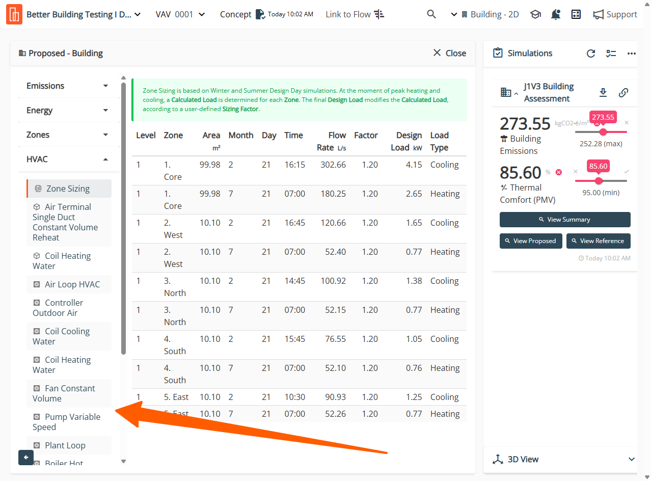 Zone sizing establishes peak heating and cooling loads for each zone through design day simulations, analysing the hottest day for cooling and coldest day for heating rather than full annual periods. The outputs include design load in kW and required supply airflow in L/s for each zone. Peak occurrence timing differs by zone depending on orientation, internal gains, and solar exposure. A sizing factor, typically ranging from 1.15 to 1.25, is applied as a safety margin to account for uncertainties.