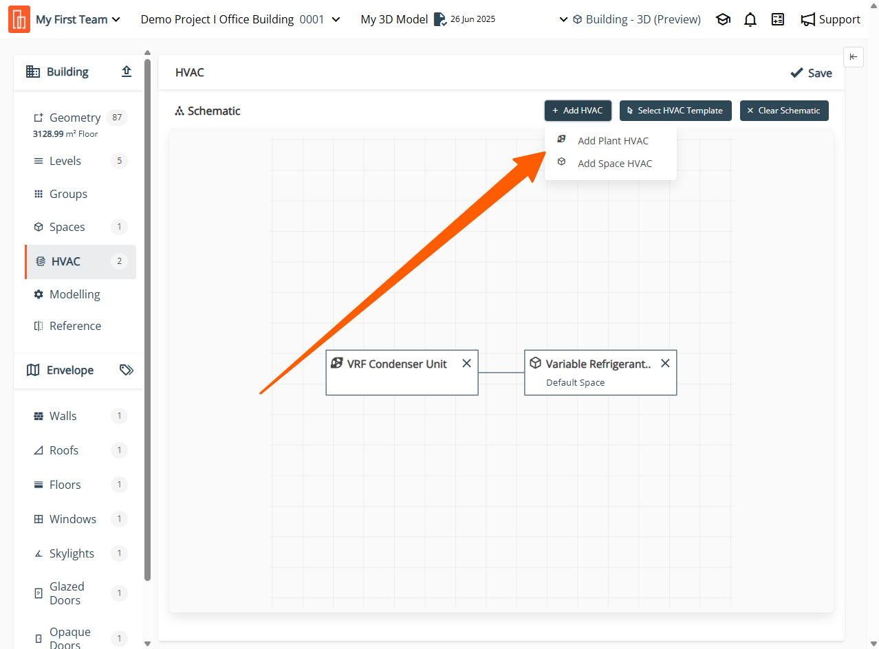 To Add Plant HVAC, navigate to 'HVAC' and select the 'Add Plant HVAC' in the Schematic ribbon. Then, navigate to 'Type' and search for the desired system. See below for more details.
