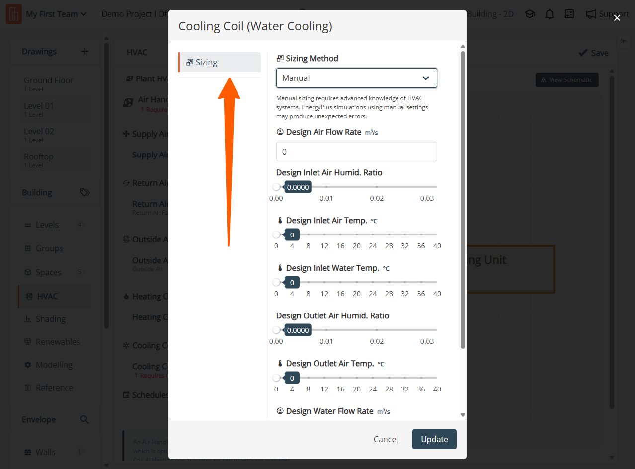 Specify the Sizing Method by choosing between Autosize or Manual. If Manual is chosen, provide all the following necessary sizing parameters.