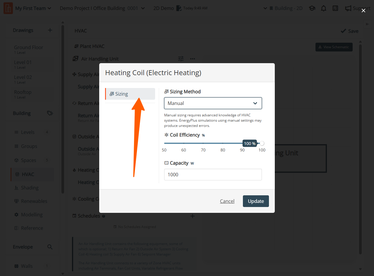 Specify the Sizing Method by choosing between Autosize and Manual. If Manual is selected, ensure all required sizing parameters are specified.