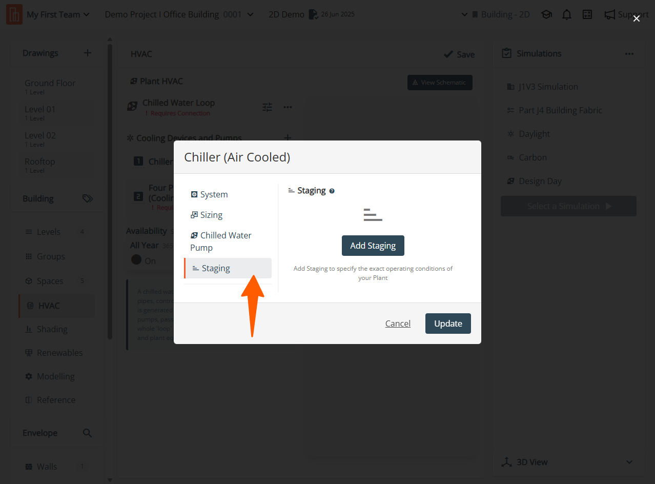 Specify the staging configuration for the chiller. Staging controls the component's activity across different duty ranges. Add stages to manage each chiller's operation based on the total chilled water loop cooling demand within specific ranges.
