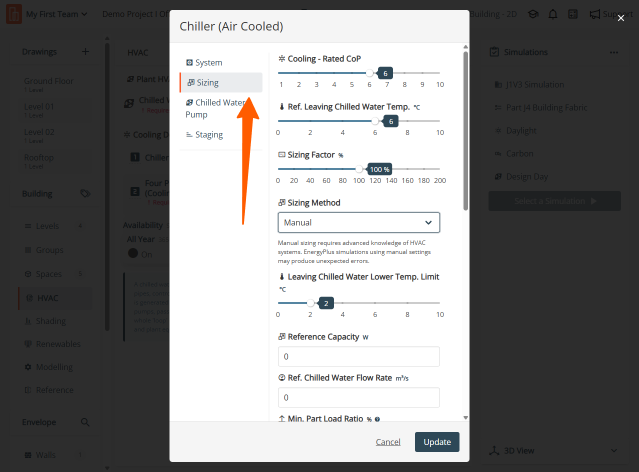 Specify an optional sizing factor for this component, a numeric field that influences the autosizing of certain design inputs. When autosizing, the calculations are performed as usual, and the results are multiplied by the sizing factor. The affected inputs include Reference Capacity, Reference Chilled Water Flow Rate, and Reference Condenser Water Flow Rate. This feature enables sizing a component to address part of the design load while still leveraging the autosizing capability.
