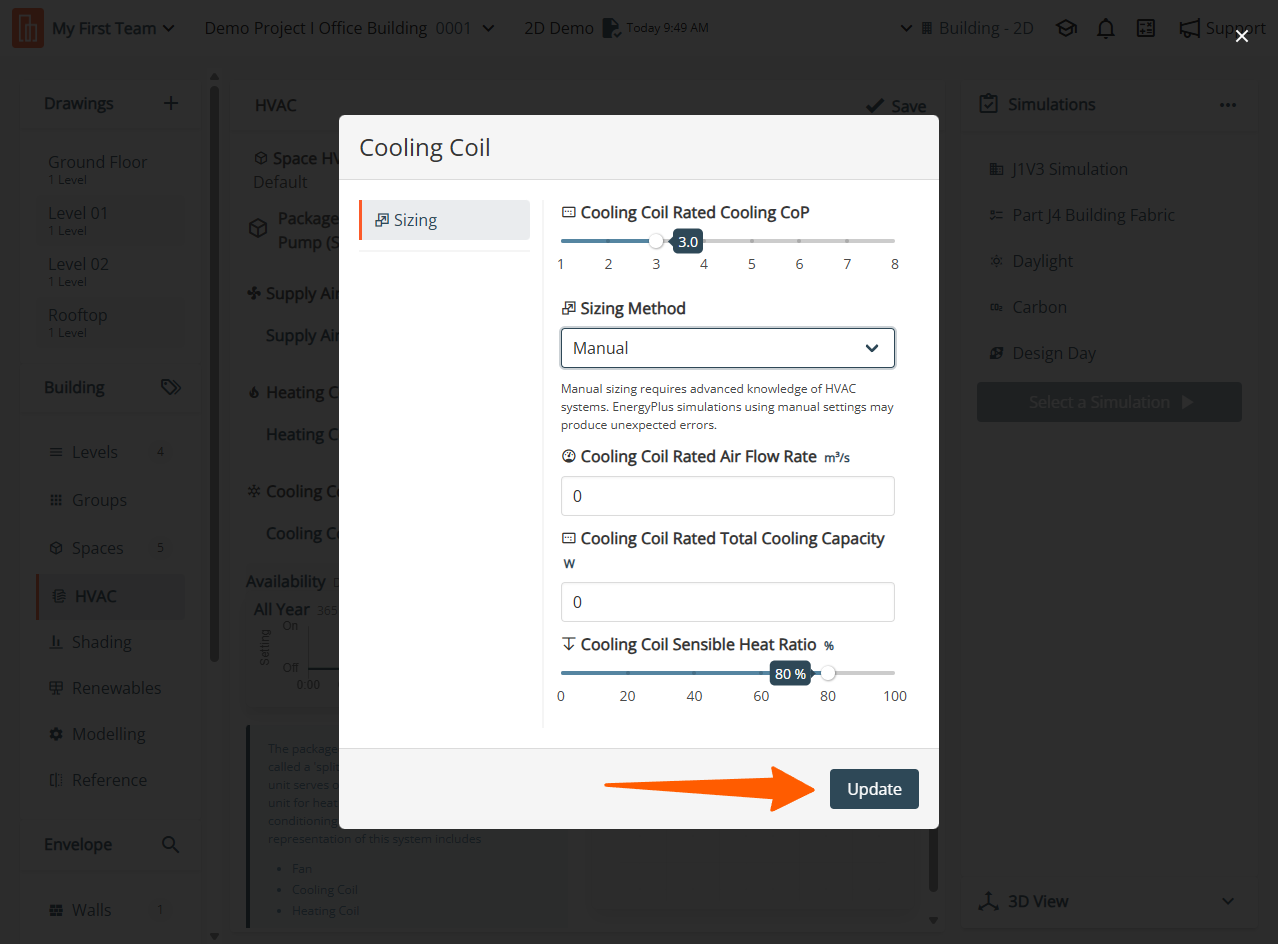 Specify the Cooling Coil Rated Cooling CoP by entering the coefficient of performance (COP), the ratio of gross total cooling capacity to electrical power input at rated conditions. This includes compressors and condenser fan power but excludes supply air fan power. If left blank, the default is 3.0.