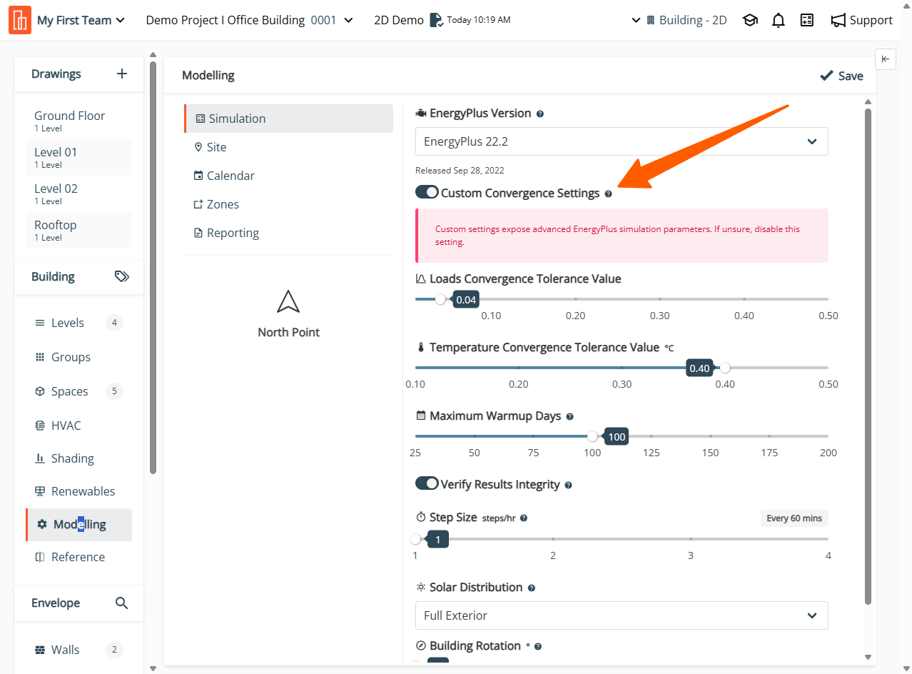 Set Building Rotation by navigating to 'Modelling' under 'Simulation'. Then, nominate the degrees from true North and hit 'Save'.