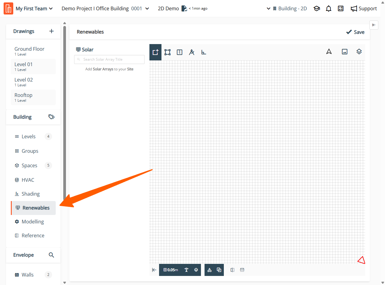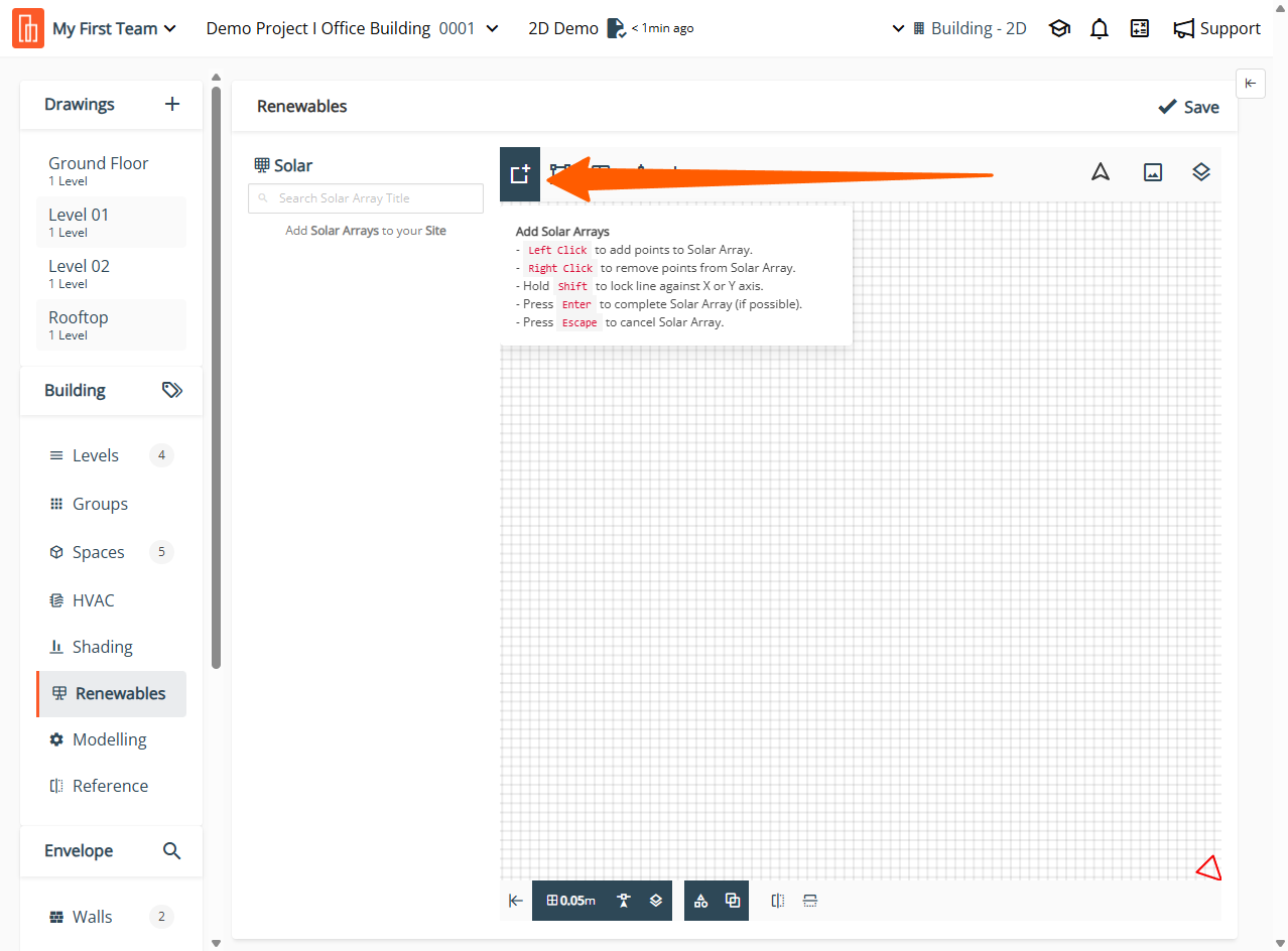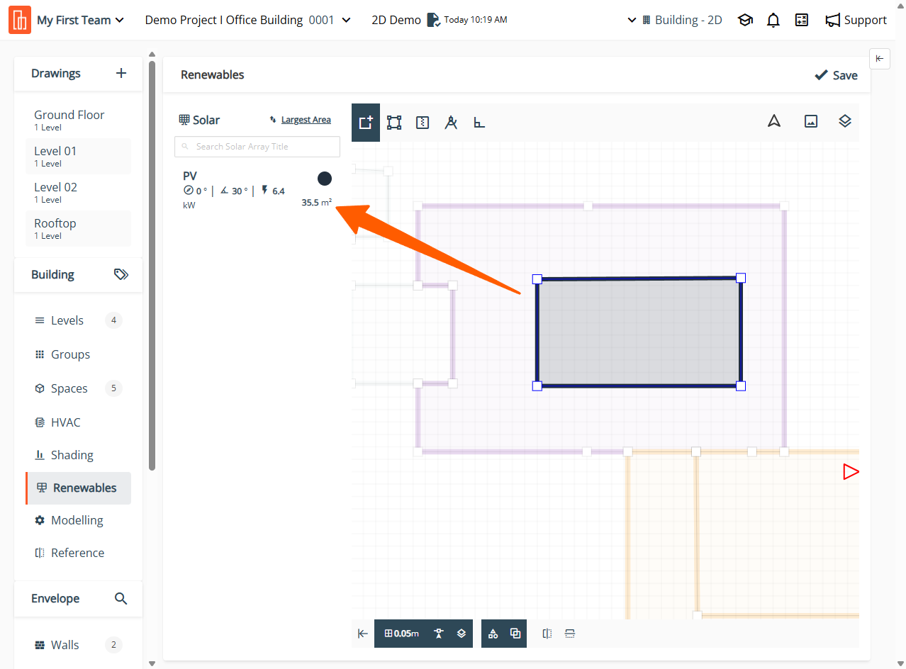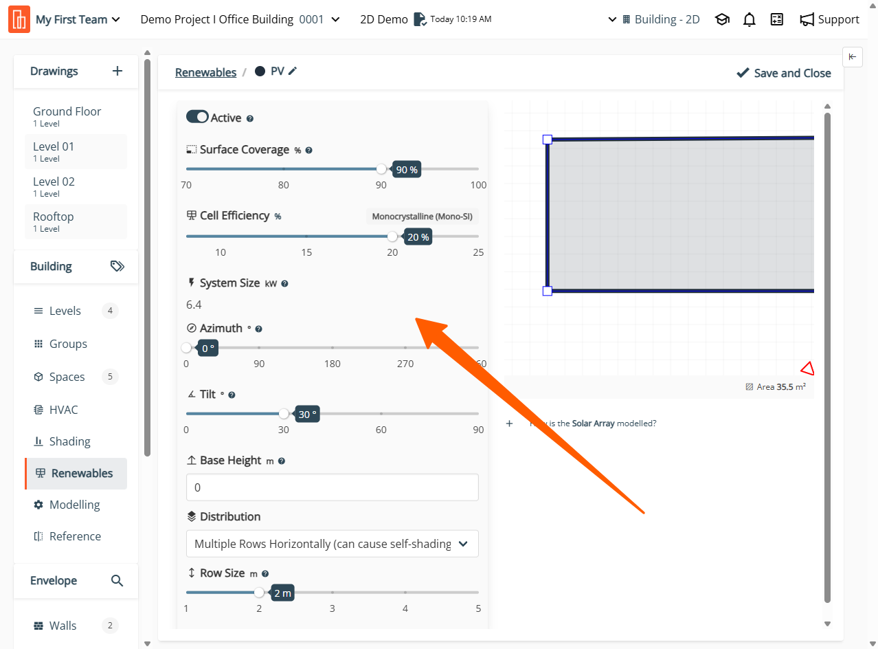 To add solar photovoltaics, navigate to the 'Renewables' button in the Site area. Select 'Draw Zones' and then draw the solar photovoltaic area you would like to consider in your model. Give it a title, and then click 'Set'. Next, left-click the newly drawn PV area and refine the 'Surface Coverage', 'Cell Efficiency', 'Azimuth', 'Tilt', 'Gap', 'Distribution', and 'Row Size'. Click 'Save & Close'.&#x20;