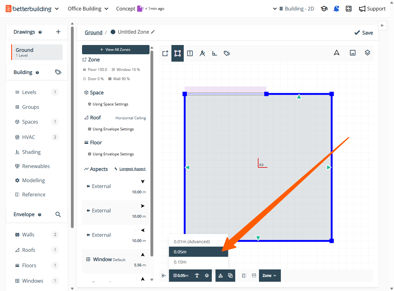 We recommend keeping snapping turned on for both Zones and Layers to help align geometry accurately. You can toggle these off if needed. Just note, using the 0.01 m grid will slow down modelling significantly and should only be used when that level of precision is essential.