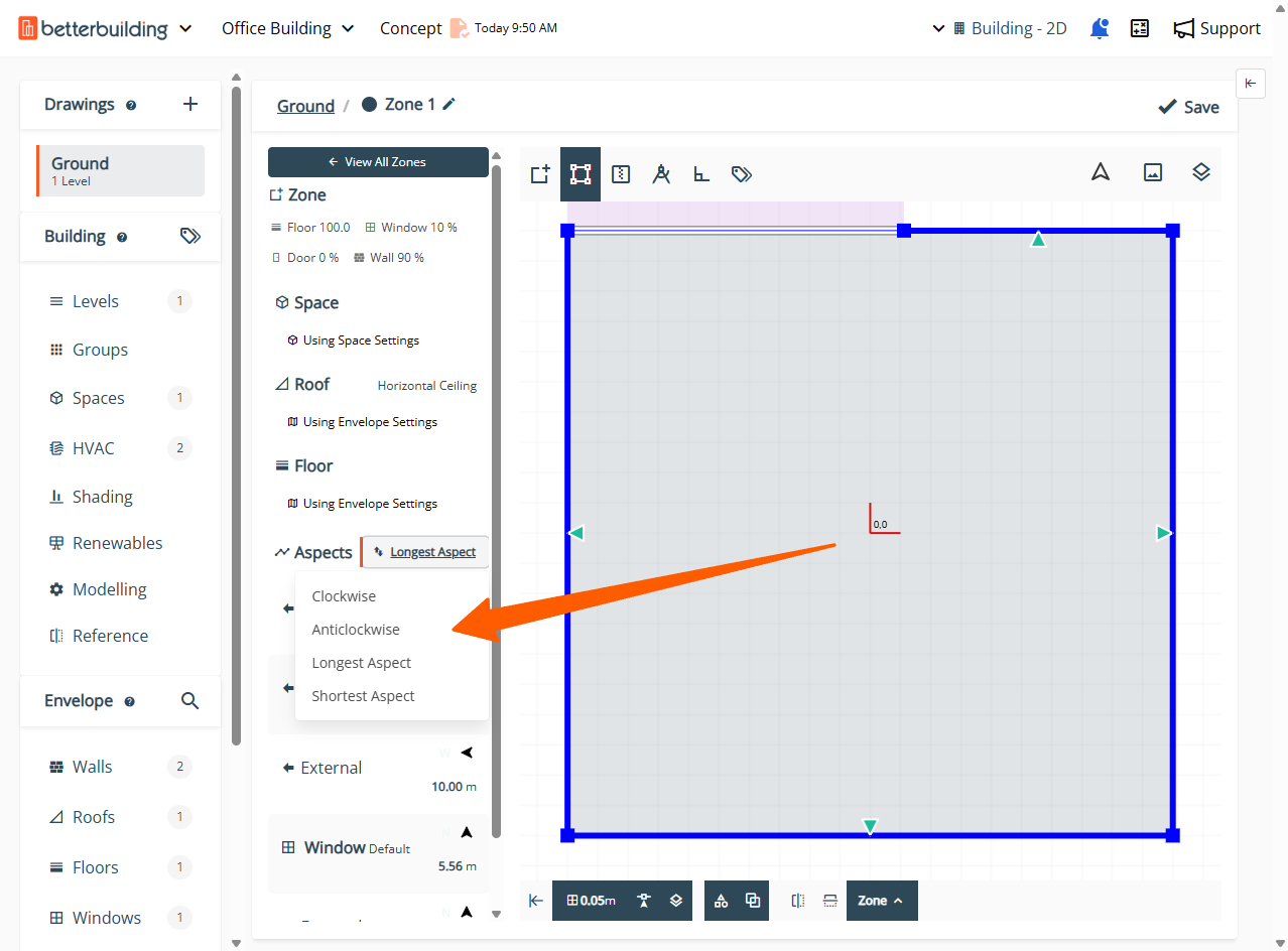 To filter aspects, use the filter dropdown, which defaults to ‘Clockwise’. You can change this to ‘Anticlockwise’, ‘Longest Aspect’, or ‘Shortest Aspect’ depending on whether you want to sort by direction or by aspect length. This helps you quickly identify and manage specific elements within complex zones.