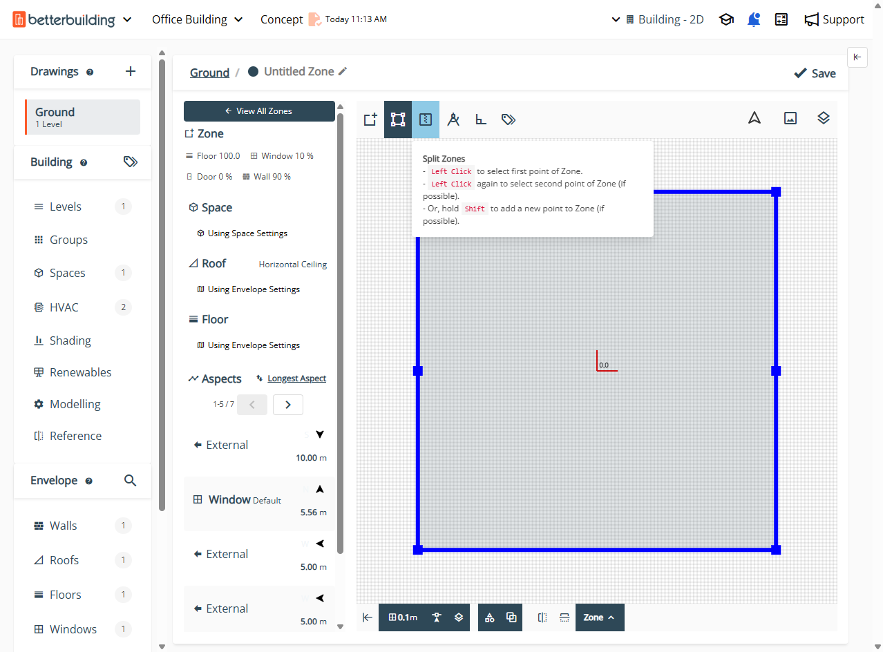 A zone is drawn to the required dimension and has the same height as all other Zones drawn over the same Drawing. Sometimes, a Zone needs to be split, or divided into smaller sub-zones for more accurate modeling.