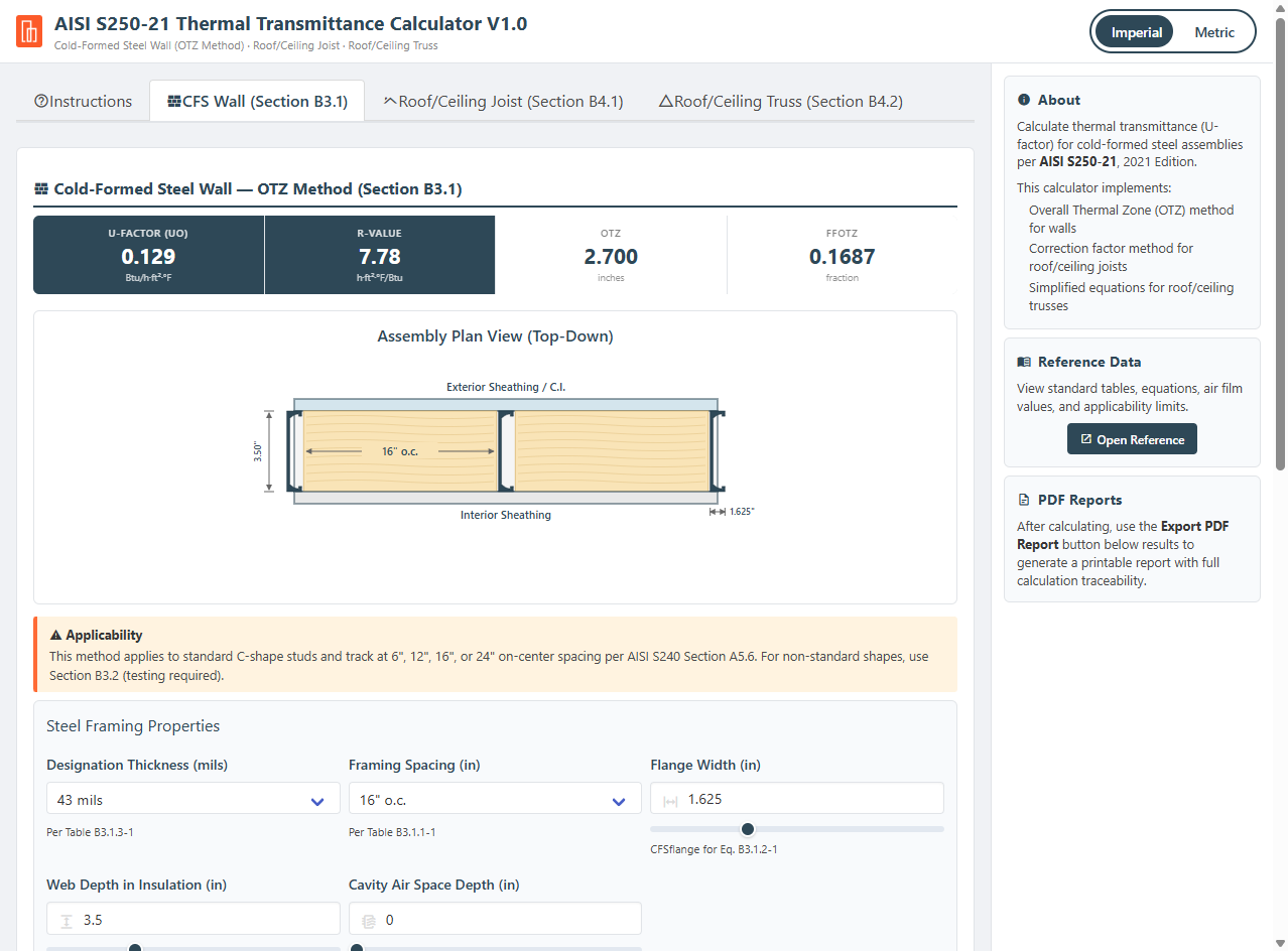 The AISI S250-21 Thermal Transmittance Calculator determines U-factors for cold-formed steel (CFS) building envelope assemblies per *AISI S250-21, North American Standard for Thermal Transmittance of Building Envelopes with Cold-Formed Steel Framing*, 2021 Edition.&#x20;