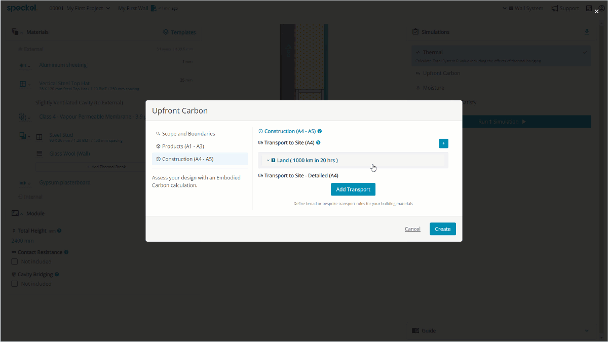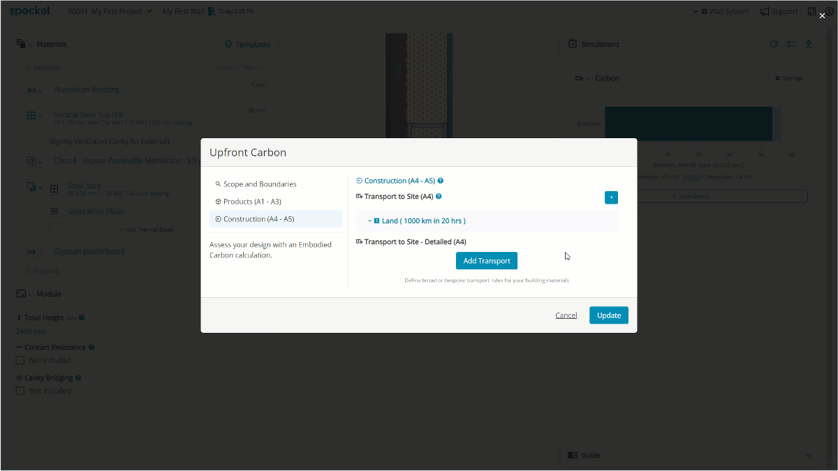 Aligning to EN15978 Standard, embodied carbon assumptions for transporting materials and products (A4) from the factory gate to the building site are set at a material level, defaulting to 1000 km per material if unknown.