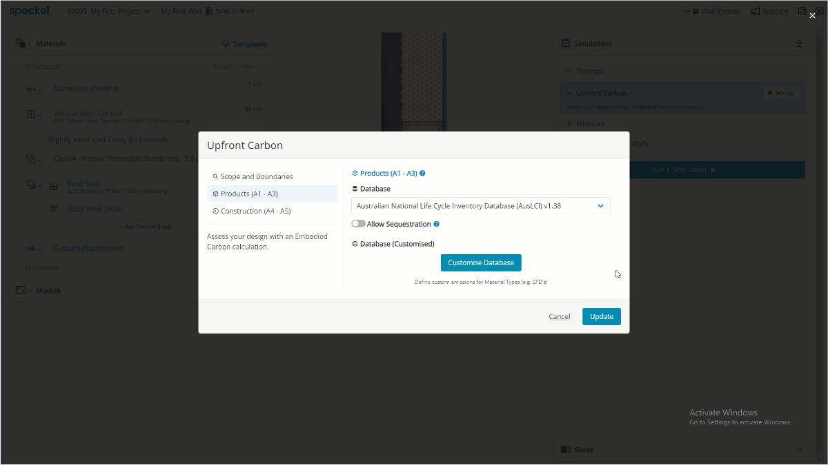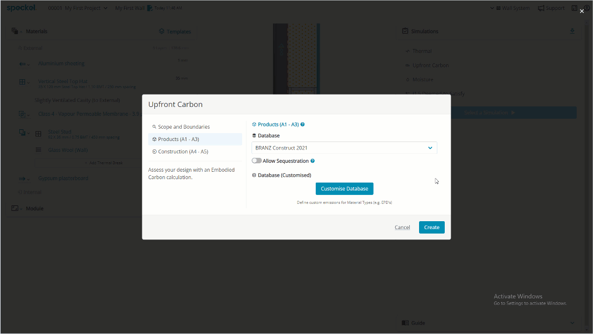 Carbon sequestration refers to specific materials, like wood, absorbing and storing carbon dioxide during their growth. To allow relevant materials to sequestering carbon, toggle the 'Allow Sequestration' switch. This is typically not included in assessments and thus defaults to off.
