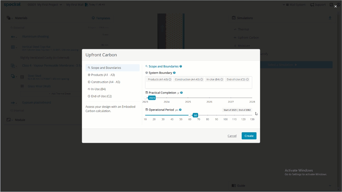 In the example below, 'System Boundaries' are refined to 'Product (A1-A3)' and 'Construction (A4-A5)' stages only by deleting the 'In-Use (B4)' and 'End-of-Use (C2)' stages from the simulation. Next, the 'Practical Completion' date and 'Operational Period' are set to define the length of the simulation period.