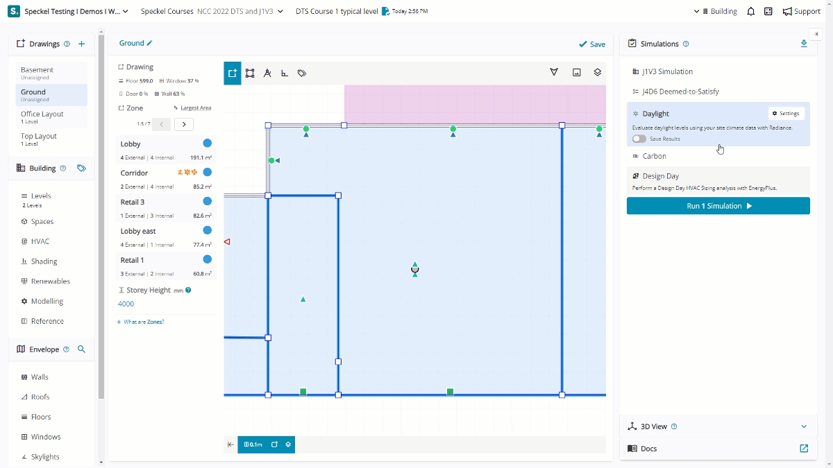 An external boundary margin (m) sets an offset from the building envelope line where illuminance data is not to be included in the results. This option is used to avoid the inclusion of potentially misleading illuminance data close to walls and windows, typically set at 0.2 m.