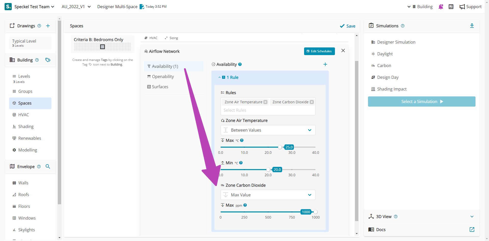 In this second example, Zone Carbon Dioxide has been added as an additional Rule. This Rule states that when the Zone Air Temperature is between a Max of 25 °C and a Min of 20 °C AND Zone Carbon Dioxide has a Max value of 1000 ppm, associated Openings will be available to Open.