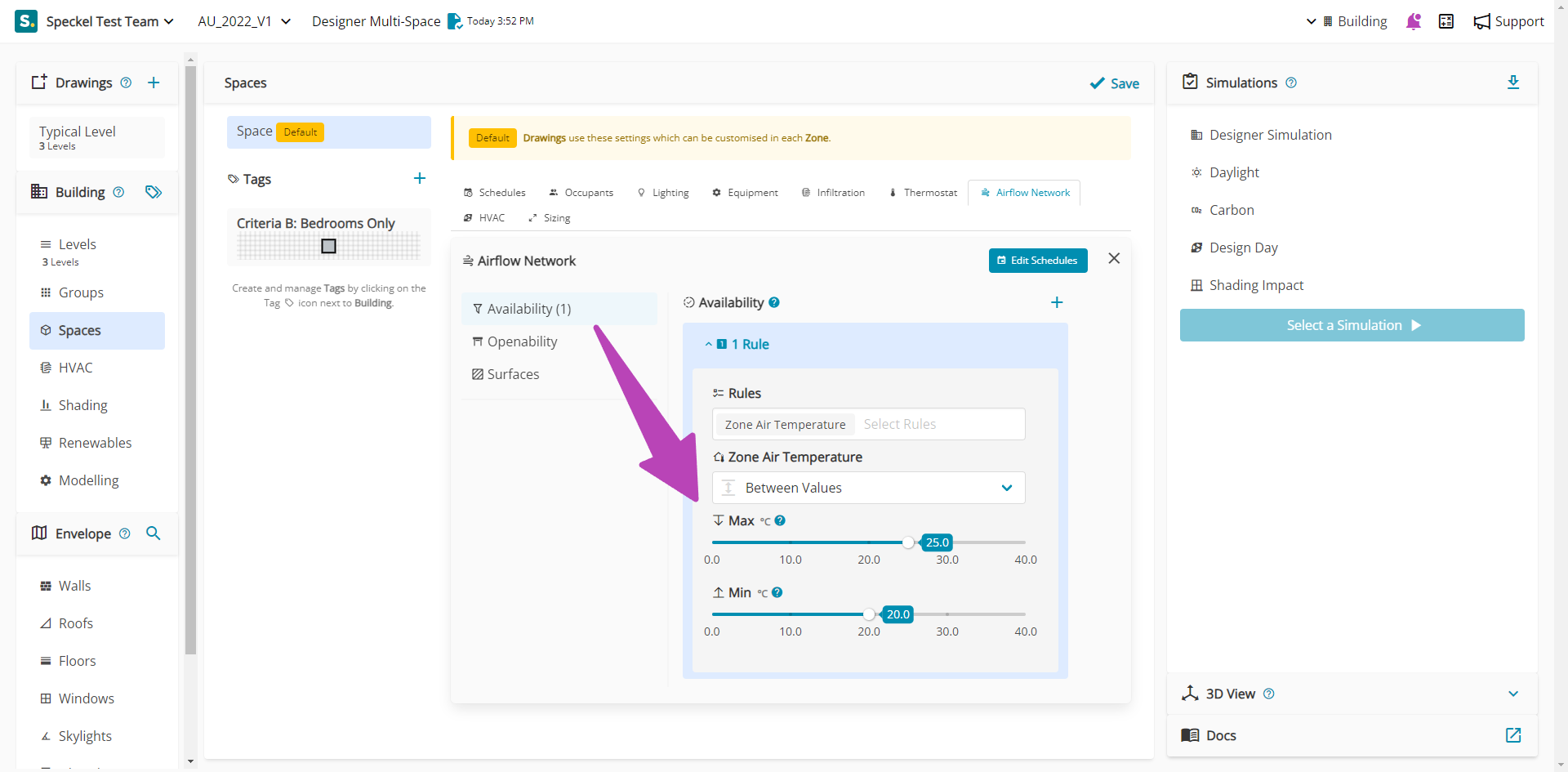 Each Rule has a subsequent list of inputs available to control the Rule. For example, where a Zone Air Temperature is selected, The Zone Air Temperature strategy and temperatures can be selected. In the example below, the Rule states that when the Zone Air Temperature is between a Max of 25 °C and a Min of 20 °C, associated Openings will be available to Open.