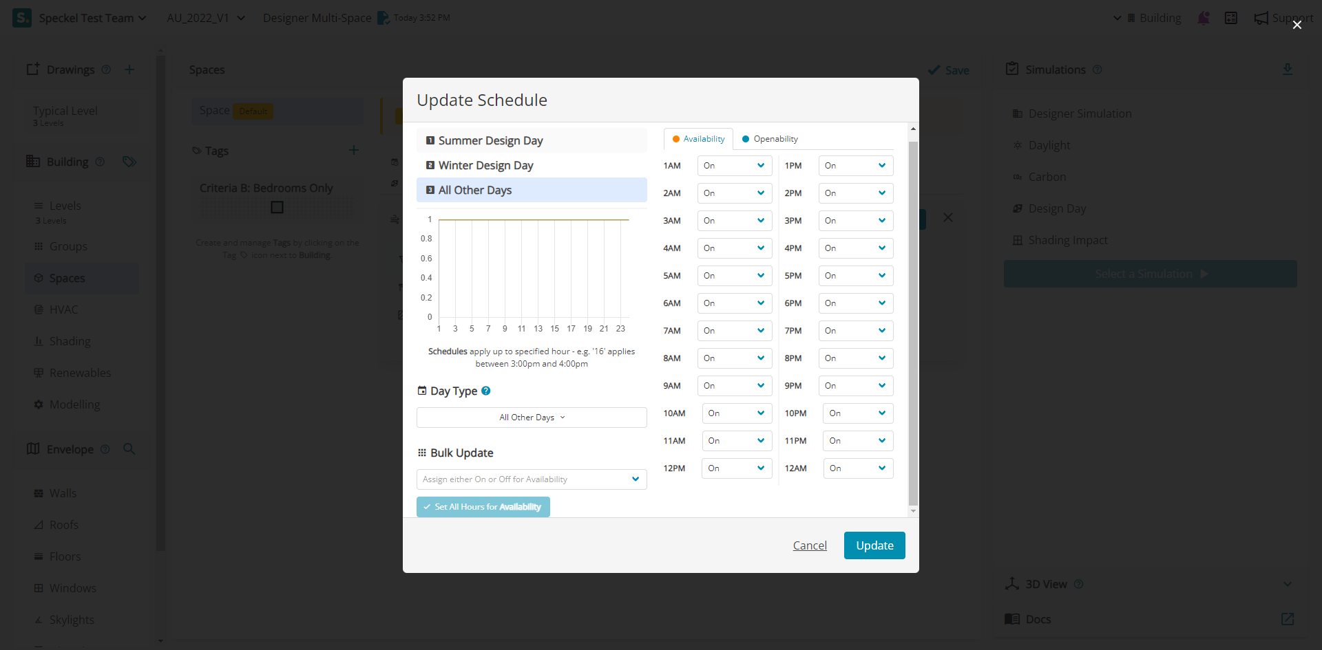 Openability schedules control the overall time in which a Rule can be adopted. They can be set for specific periods of time, such as Design Days, Weekdays, etc. They come in two types, Availability and Openability. The Openability schedule allows a window to be opened each hour, by being either On or OFF.
