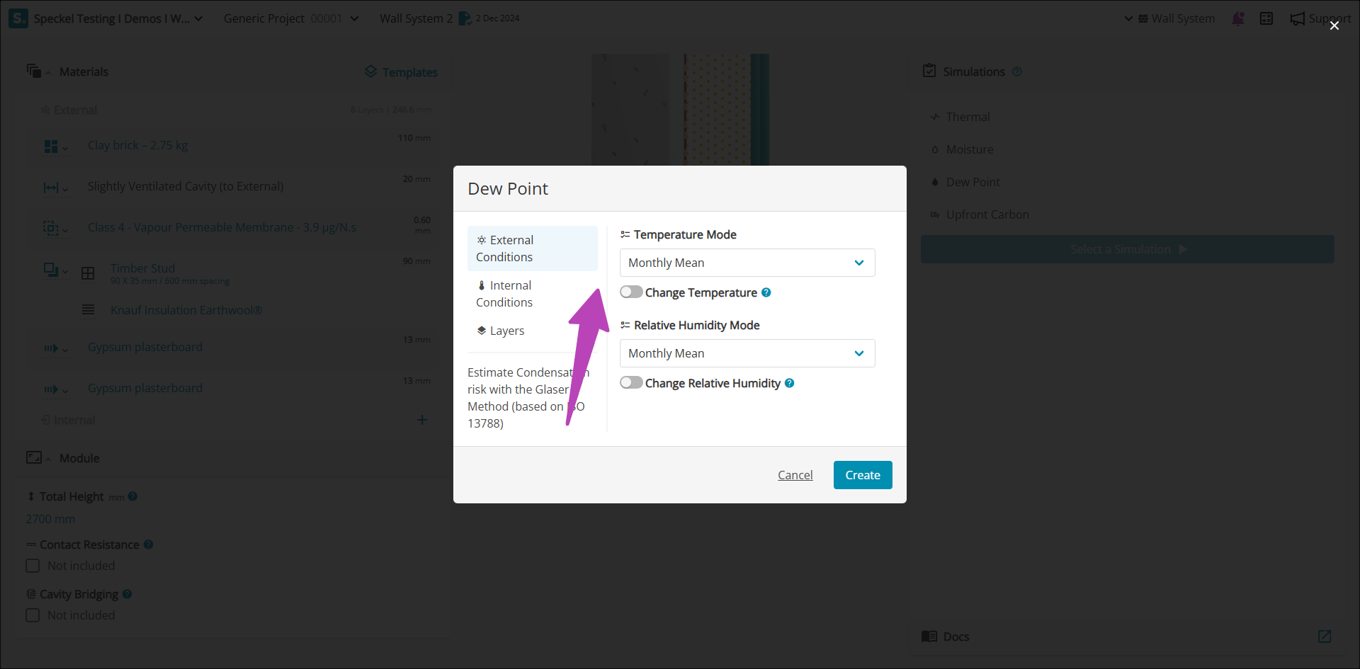 Where a more conservative assumption is required associated to the external relative humidity, it can be modified under 'Change Relative Humidity', shifting the external climate by the stated value. For example, a +5%  will modify the climate file for the location increasing all data points by 5%, resulting in higher external relative humidity.