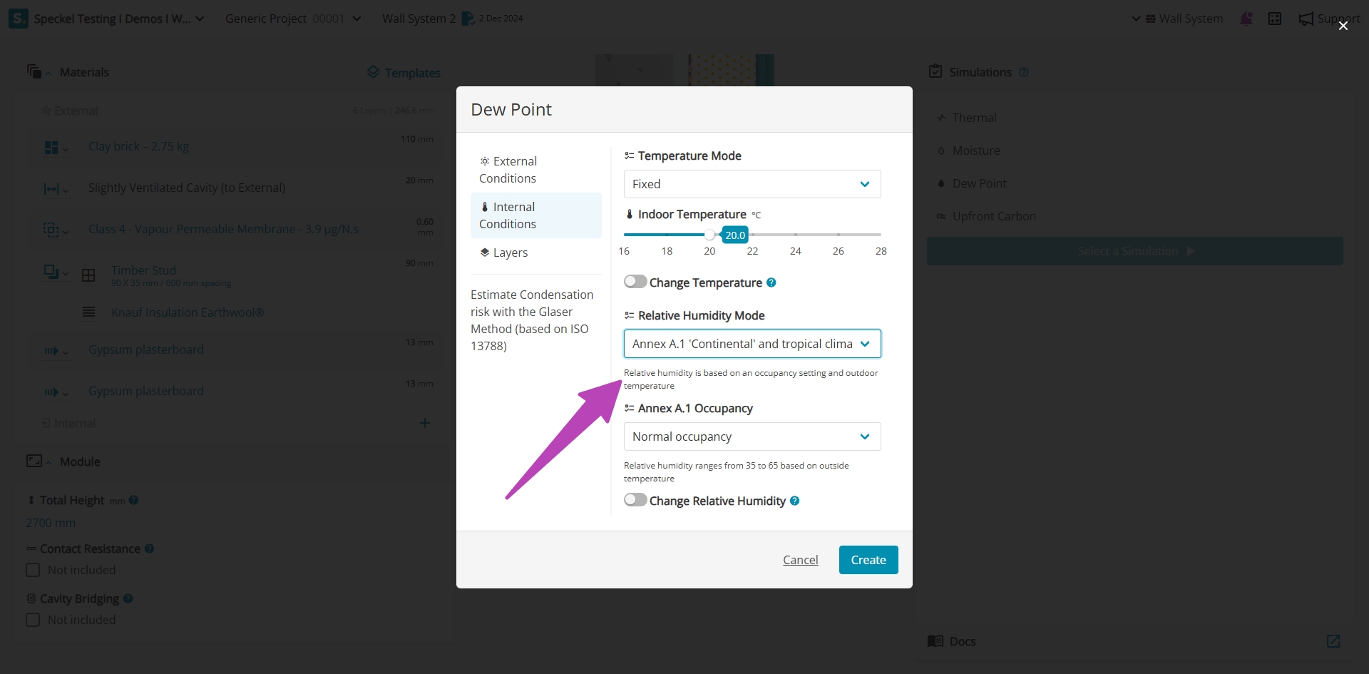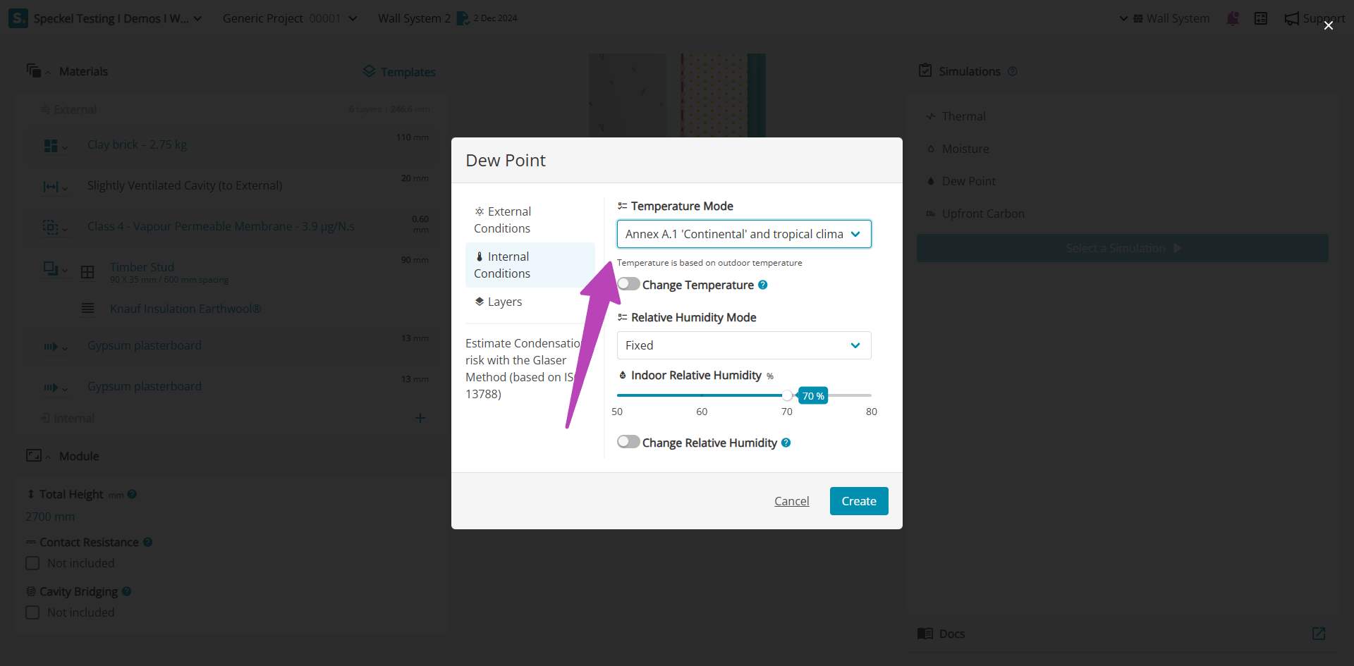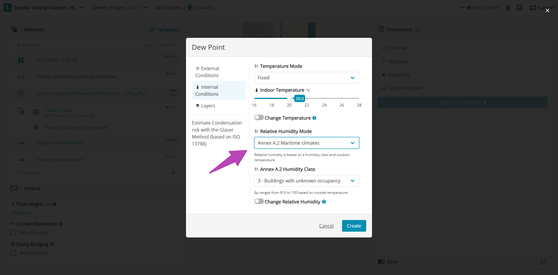 Where a more conservative assumption is required associated to the indoor relative humidity, it can be modified under 'Change Relative Humidity', shifting the indoor climate by the stated value. For example, a +5% will modify the climate file for the location increasing all data points by 5%, resulting in higher indoor relative humidity.