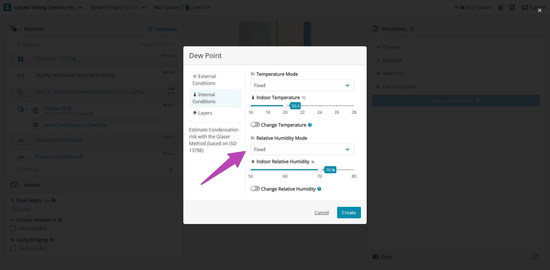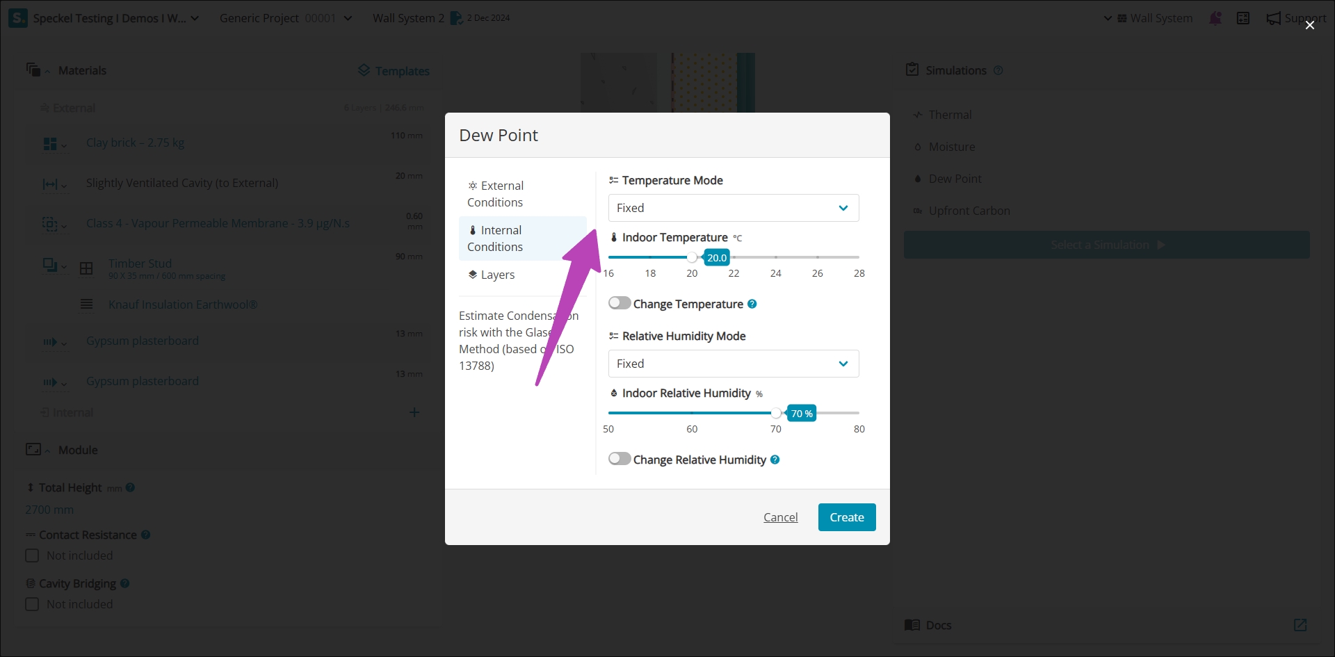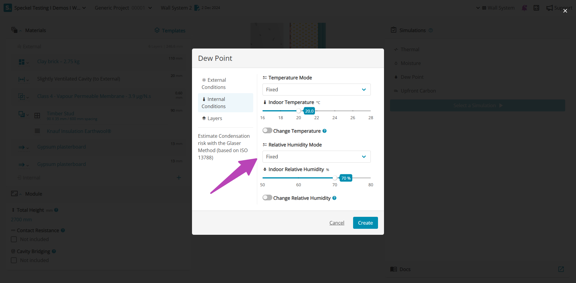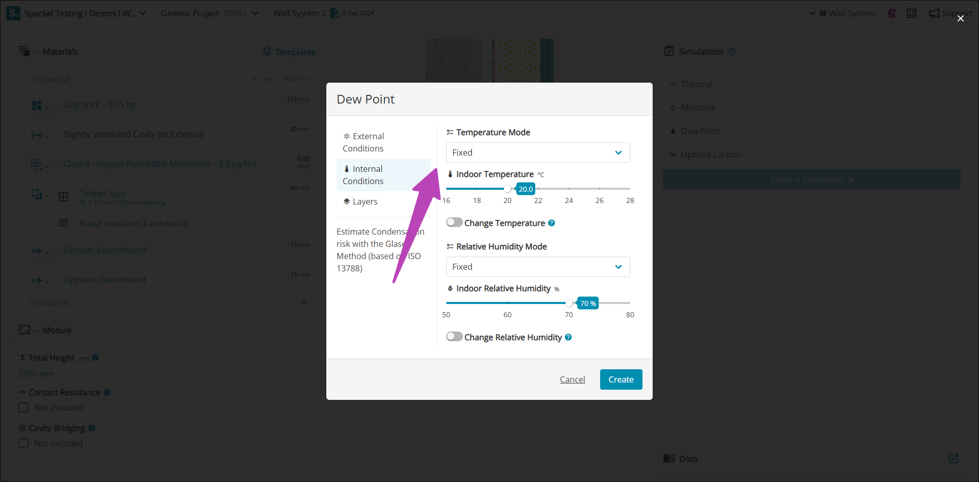 Where a more conservative assumption is required associated to the indoor relative humidity, it can be modified under 'Change Relative Humidity', shifting the indoor climate by the stated value. For example, a +5% will modify the climate file for the location increasing all data points by 5%, resulting in higher indoor relative humidity.