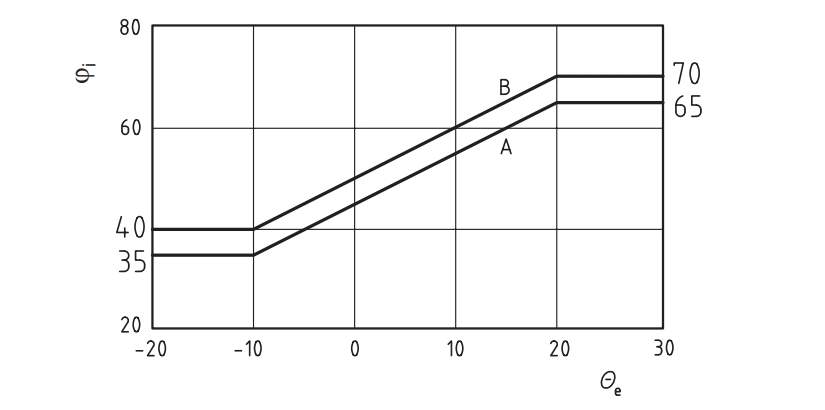 In cases where indoor air conditions are undefined, a simplified method may be applied to estimate indoor relative humidity based on external air humidity. The indoor relative humidity level is selected according to the expected occupancy of the building, being either 'Normal occupancy' (A) or 'High occupancy' (B), as per the chart below.
