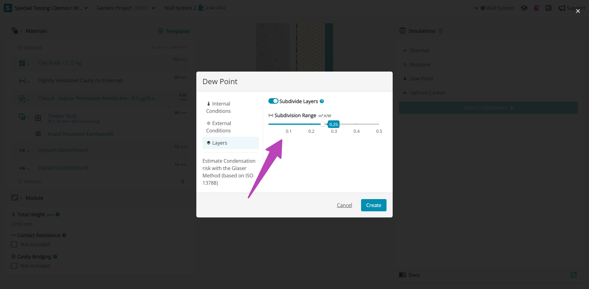 ISO 13788 recommends subdividing elements with a thermal resistance exceeding 0.25 m²·K/W into multiple notional layers, each with a maximum thermal resistance of 0.25 m²·K/W. These subdivisions should be treated as individual material layers, with interfaces between them considered in all calculations.