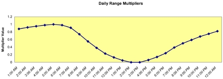 The range multiplier values depict diurnal temperature patterns, where the lowest temperature occurs around 5:00 AM and the highest around 3:00 PM. It's important to note that EnergyPlus doesn't adjust the profile based on solar noon, as permitted in ASHRAE procedures.