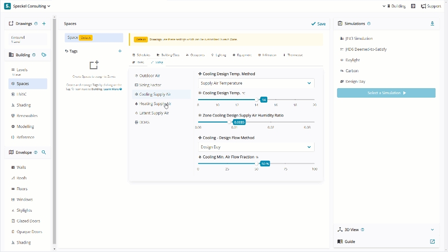To model a 30% minimum airflow in an air handling unit system for each applicable Space, go to 'Space Sizing', select 'Cooling Supply Air', and adjust the 'Cooling Min. Air Flow Fraction' to 30%. Next, on the 'HVAC Schematic', select each applicable 'VAV Terminal. Go to 'Air Terminal Settings', then 'Sizing', and adjust the 'Constant Min. Air Flow Fraction' to 30%. Lastly, On the 'HVAC Schematic', select each applicable 'AHU Unit'. Go to 'Air Handling Unit Settings', then 'Setpoint Manager Settings', and adjust the 'Min. Turndown Ratio' to 30%.