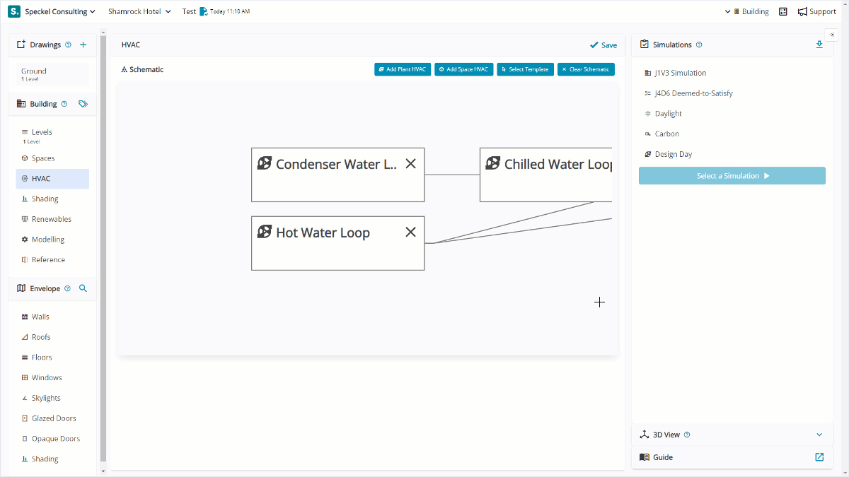 To model an air source heat pump, select the 'Hot Water Loop' on the HVAC Schematic. Then, click the 'plus' button next to 'Heating Devices and Pumps' and choose 'Air Source Heat Pump' from the menu.