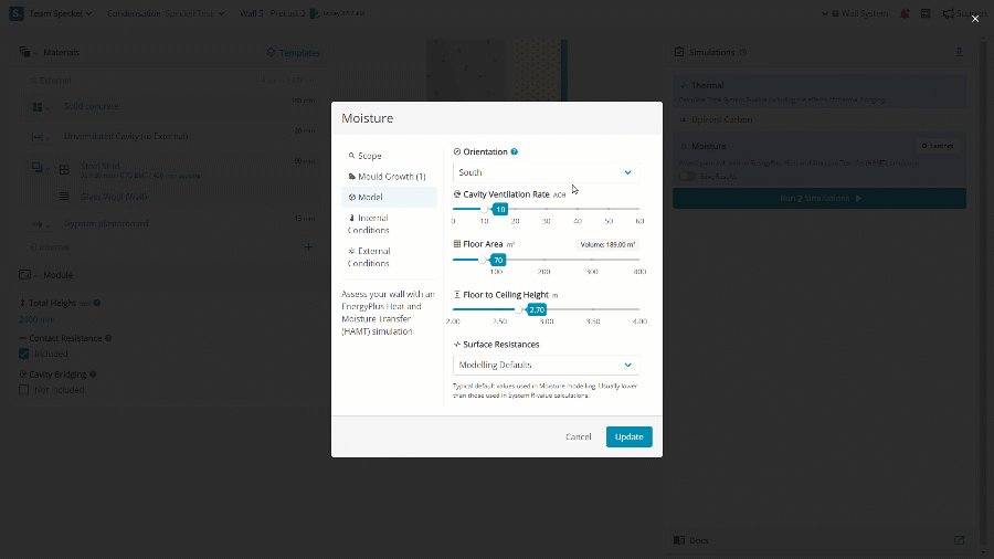 Cavity ventilation rate refers to the rate at which air moves into and out of a cavity within a building structure, such as a cavity wall or a ventilated rain screen. Ventilation can help remove moisture from a cavity, reducing the risk of condensation and related problems. In hygrothermal modelling, the cavity ventilation rate is a critical factor that can affect the moisture balance in building elements.