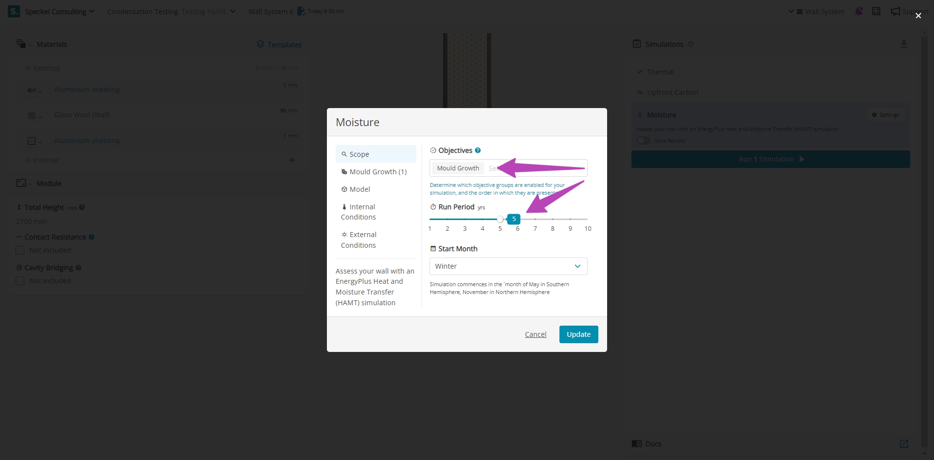 The example inputs and results below are for a cold climate over a 5 year Run Period, using the Mould Growth Index Objective to assess the spandrel moisture performance.